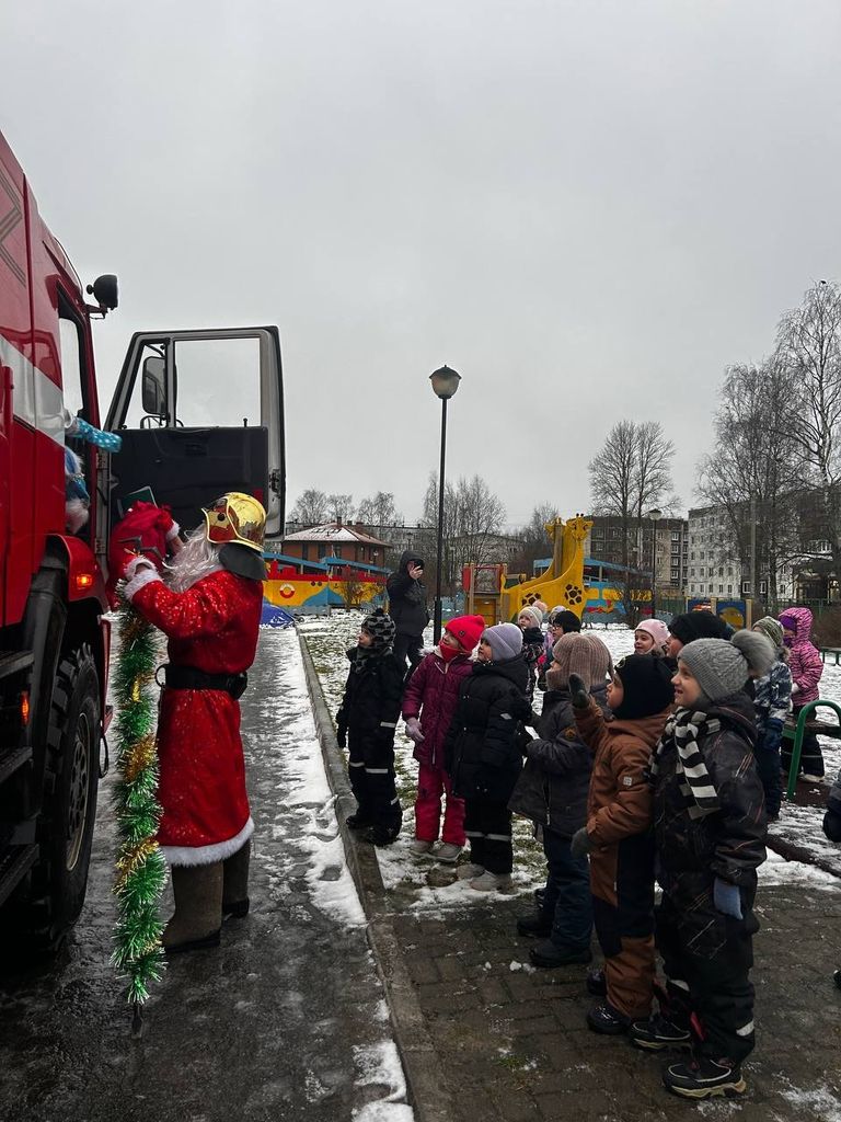 В завершение дети подарили подарки пожарным, а Дед Мороз в ответ вручил детям подарки при содействии председателя совета Кировского местного отделения Ленинградского областного отделения Общероссийской общественной организации «Всероссийское добровольное пожарное общество» – Никулина Александра Владимировича.
